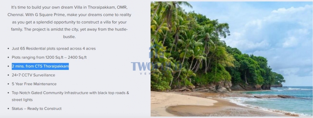 It’s time to build your own dream Villa in Thoraipakkam, OMR, Chennai. With G Square Prime, make your dreams come to reality as you get a splendid opportunity to construct a villa for your family. The project is amidst the city, yet away from the hustle-bustle.