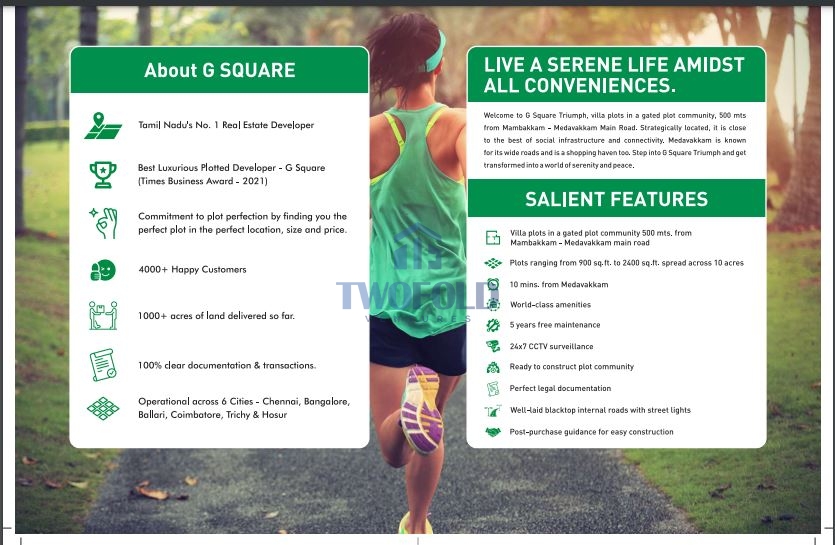 Triumph by G Square is located at Madambakkam, Chennai. This project is in close proximity to shopping malls and entertainment avenues. Spanning across 10 Acres, these ready-to-construct residential villas are perfect for families.