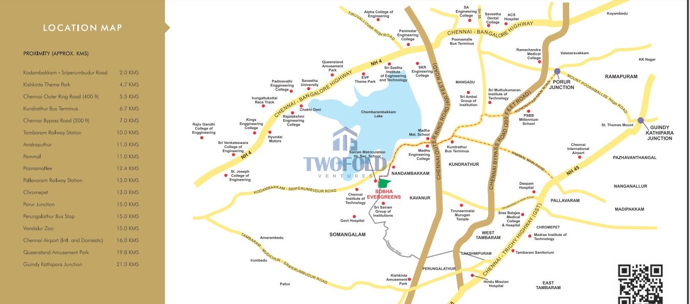 SOBHA Evergreens is located at Nandambakkam – Kundrathur Village, Kavanur, Chennai, Tamil Nadu 602109.