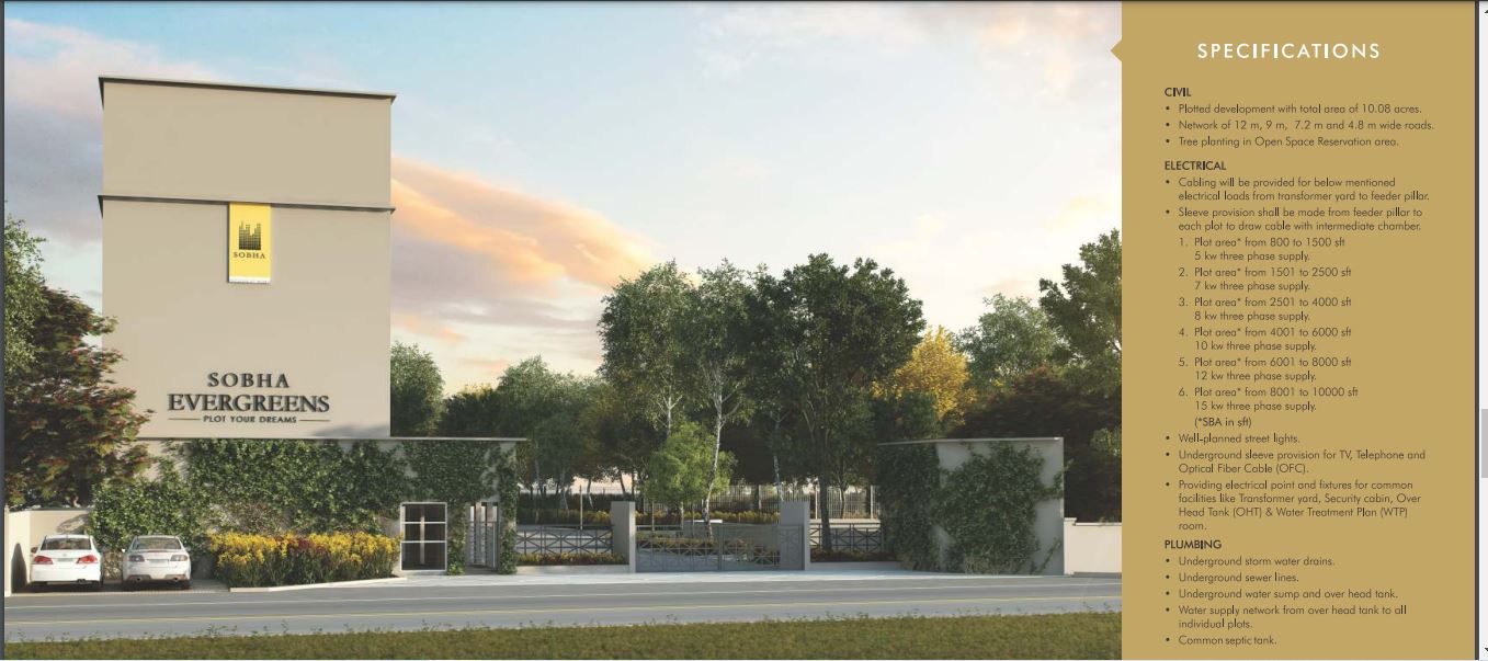 The amenities at SOBHA Evergreens include 24 hrs Power Backup, Streets and green areas, Water Supply, Water drainage & Sewer Line, Blacktop Roads, Street Lighting, Electrical & Optical fibre Cabling, and more…SOBHA Evergreens has a total of 177 plots.