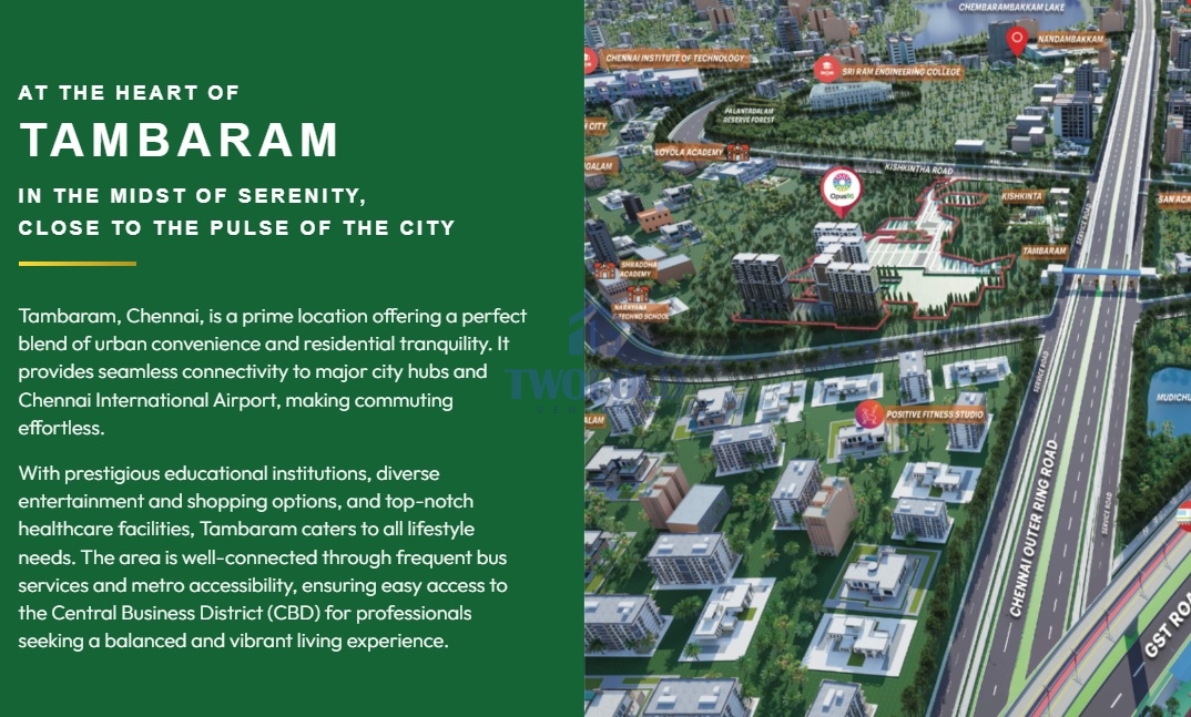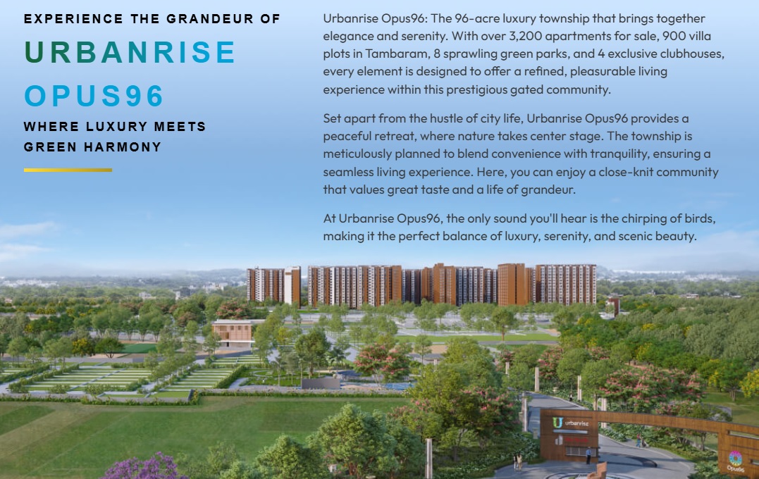 The 96-acre luxury township that brings together elegance and serenity. With over 3,200 apartments for sale, 900 villa plots in Tambaram, 8 sprawling green parks, and 4 exclusive clubhouses, every element is designed to offer a refined, pleasurable living experience within this prestigious gated community.
