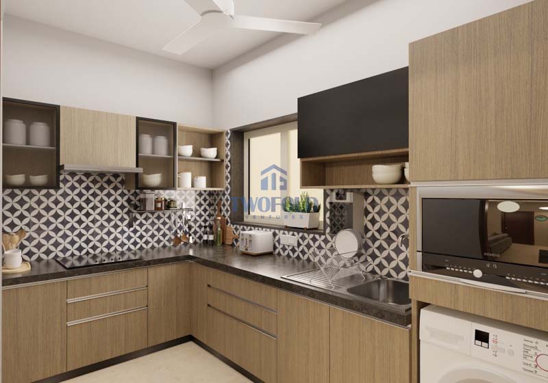 - Kitchen: Minimum size of 600 x 600 mm vitrified tiles (Indian/Imported)*