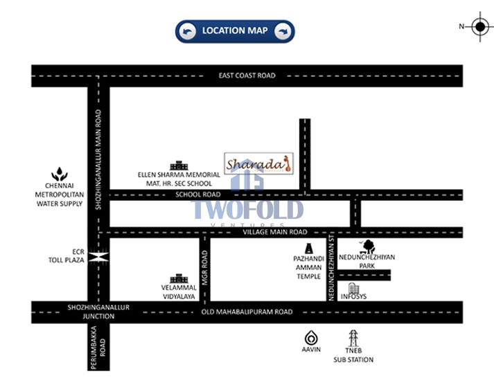 The project “Sharada” is located in the heart of Sholinganallur and proximity to both OMR & ECR inside a CMDA approved layout. The project is surrounded by road on all 4 sides and is in an already developed residential colony. Close to schools & educational institutions, the project is ideal for those employed in the IT sector and MNC’s in OMR.