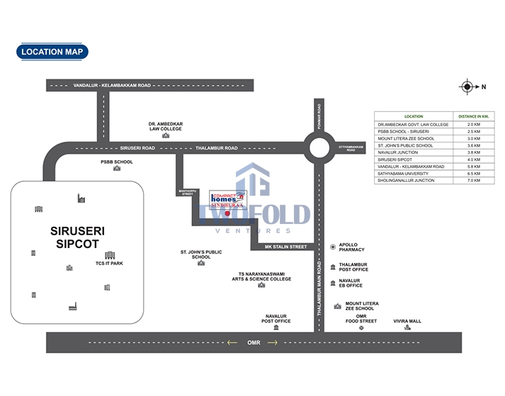 The project “Sindhuraa” is located in the heart of Siruseri and close proximity to Thalambur main road, Navalur & OMR the IT hub of Chennai. Siruseri has emerged as a significant real estate destination and it is conveniently placed along the Old Mahabalipuram Road (OMR) and the most prominent IT parks in Chennai namely SIPCOT IT Park. The locality is continuously developing in to a residential hub surrounded by residential development and other social infrastructure. Close to schools & educational institutions, the project is ideal for those employed in the IT sector and MNC’s in OMR.