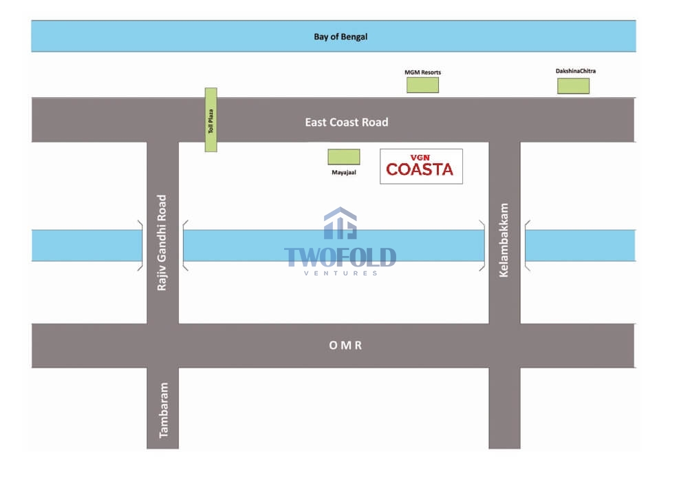 Wake up every morning to the views of Bay of Bengal and the sound of waves at VGN Coasta . Located less than 1 km from Mayajaal opp MGM and close to work, schools, hospitals, theatres and amusement parks, VGN Coasta is the place to live. Located on the East Coast Road, the road running all along the famously tranquil Coromandel coast. Close to modern amenities and yet with adequate privacy, ECR offers you the best of both worlds. No wonder the most happening spot, both to live in and as an investment. Come indulge and live the beach life !